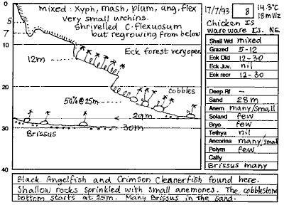 For optimal kelp growth, a north facing slope is wanted but very often these slopes are also very exposed. For studying sponges, a site with a deep reef habitat is required but it must also be sheltered. But wherever shelter is found, the bottom is shallow too, leaving no room for a deep reef habitat. Places with deep bottoms are also often very steep, thereby shading out the sunlight for part of the day and making life difficult for sea urchins. Places with drop-offs, cracks and gullies invite a richer diversity of life but they also form barriers to sea urchins, changing their 'natural' range. Several dives had to be aborted because the chosen spot proved to be unsuitable. In practice we spent much time studying (three-dimensional) depth sounder recordings before deciding where to dive. |