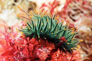 of gills. It is a finger-long seaslug that feeds on the tough deadmans