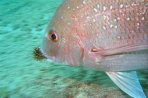 has found a sea urchin and flees from the attention of other snappers.